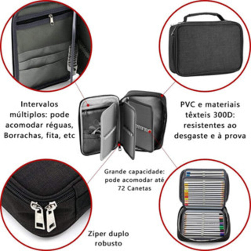 Organização Perfeita: Possui 4 compartimentos com elásticos individuais que comportam até 72 lápis ou canetas, evitando que eles fiquem soltos e quebrem as pontas.