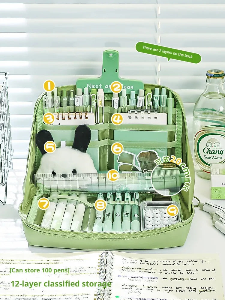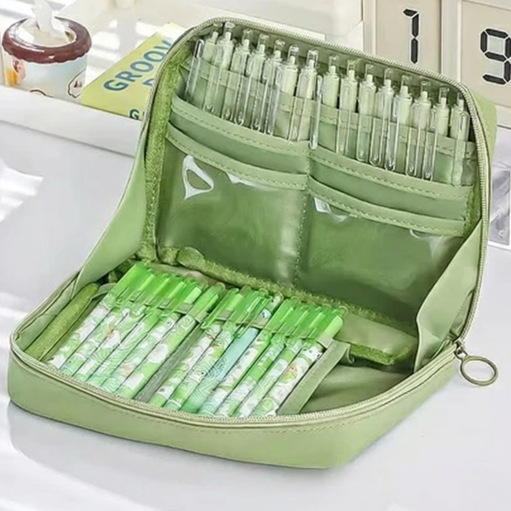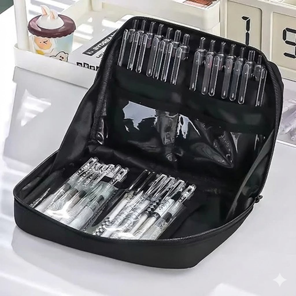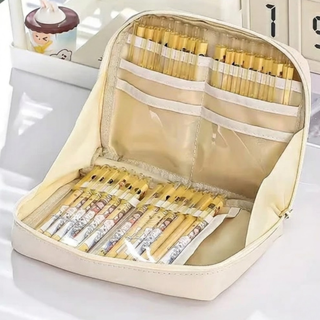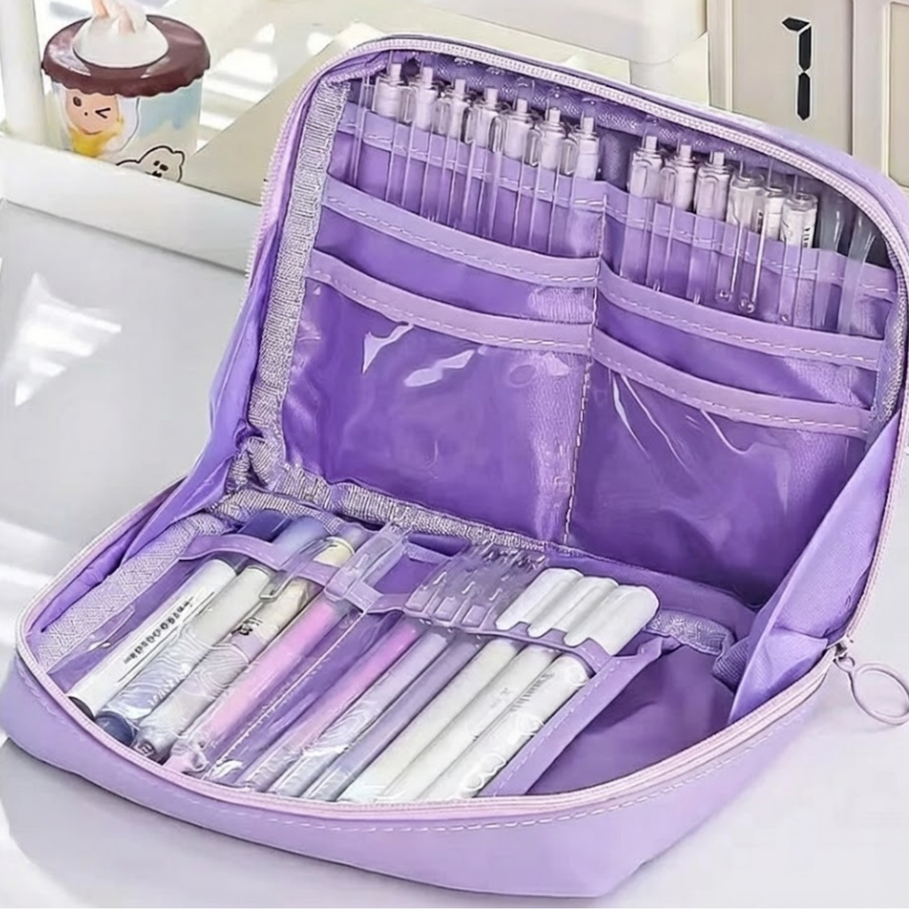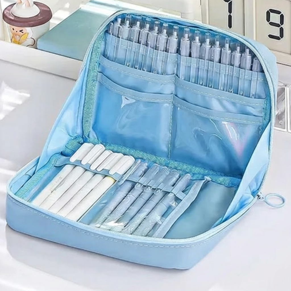 Grande capacidade = canetas, lápis, borracha, régua, adesivos... TUDO organizado!
