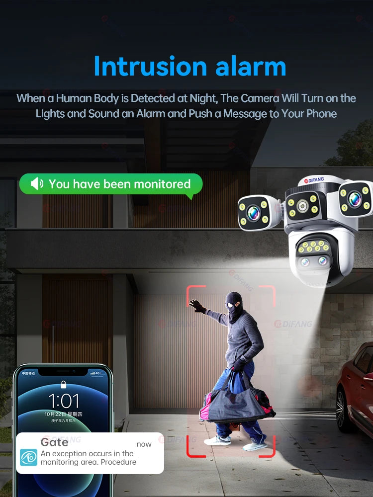 * When human movement is detected, the camera will track the movement of the human body, emit lights, and send real-time alarms;360° automatic tracking, 24/7 monitoring, alarm area can be set.
